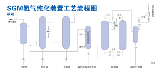 氮氣純化系列裝置 氣體純度:≥99.9995% 氧含量:≤2ppm 二氧化碳含量:≤1ppm 露點:≤-60℃ 技術特點: 若用戶所需氮氣摜標大于99.999%時,在我公司制氮機設備的基礎上配置純化設備。本系列產(chǎn)品采用碳載脫氧催化劑,不需消耗氫氣源,碳與氮氣中的余氧反應生成二氧化碳,再采用變壓吸附工藝除去二氧化碳和水,經(jīng)過濾后得到高純度氮吸附工藝除去二氧化碳和水,經(jīng)過濾后得到高純度氮氣。高純度氮氣技術指標可達O2≤2ppm,CO2≤1ppm,露點≤-60℃。